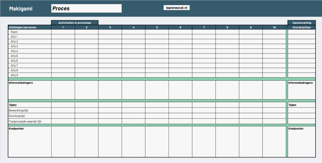(Excel) tools die hier o.a. bij kunnen helpen zijn: Flowcharts (met swimming lanes), simpele VSM tot complexe waardestroom analyses (Value Stream Map, VSM), Makigami (flowchart voor digitale processen) etc.